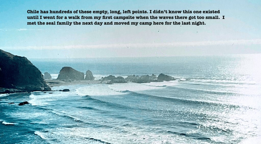 On my last afternoon in Pichilemu, a new big swell boomed in from the south. I’d been planning a lazy day to rest before my flight home, but I failed to resist the urge to hitch the eight kays out to Punta de Lobos for one last look. The swell was huge, windblown and wild and I was the only one there. I climbed down the cliff to get out of the wind with the seals and penguins sheltering on the rocks and pictured the perfect waves that would be breaking, unridden, over the next few days in front of where I’d pitched my tent.