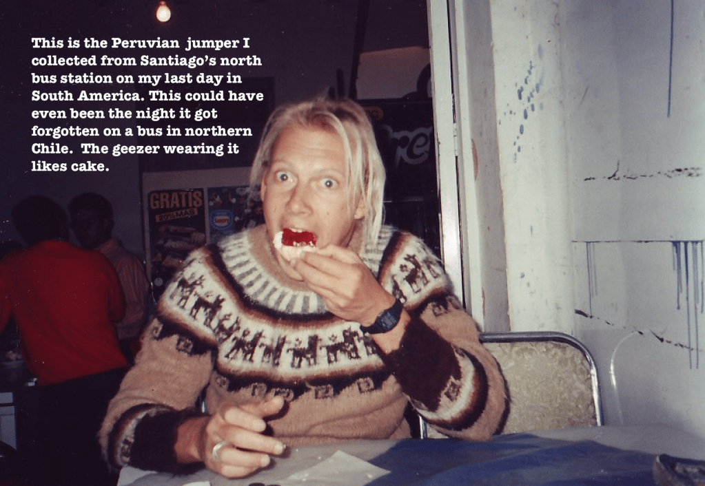 But on the five-hour bus trip to Santiago that morning, I must have nodded off for at least a few shakes of a lamb’s tail. For when I arrived in town, I raced round like a lunatic. I deposited my board and backpack in the south bus station storage office, then took a bus across town to the north bus station where the Peruvian alpaca jumper I’d lost on a bus in far north Chile a few weeks before was waiting to be collected. Then I raced downtown to collect more luggage I’d stored at the pension where Sunara and I had stayed ten days before. Then I taxied back to the south bus station to collect my board and backpack. From there I took another taxi to the bus that took me to the airport, where I repacked my boards and bags to be ready for the flight.