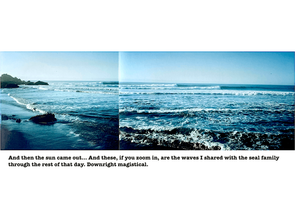 My first thought was that my surfboard fins might hit her, but she knew exactly what she was doing. As I turned off the bottom or banked off the top, so did she, just a metre ahead, and we raced that wave together the length of the bay. She disappeared as I turned off the wave and I didn’t see her on my long paddle back out. But she was waiting for me when I arrived at the top of the point, and this time she’d brought the whole family. Perhaps I’d been accepted; maybe even adopted. We rode those waves together into the dusk till my lips and fingers turned blue in the cold.