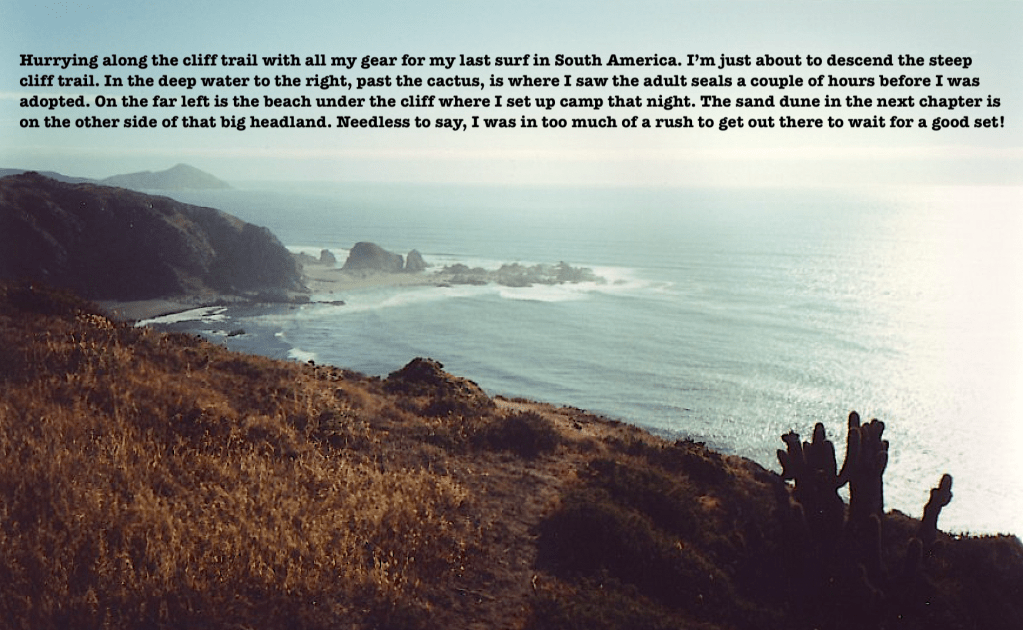 Pichilemu was only two hundred kilometres from Santiago, but it moved at an elegant, horse-drawn-cart pace, and the Hotel Chile-Espana was a great place to hang out. A couple of times we hitched south to the now-much-more-world-famous surf break, Punta de Lobos. Here there were penguins, dolphins, seals, a small, friendly Chilean beach crew on weekends, and great long left waves on a cactus-lined point that stretched out to twin rock towers painted white by the seabirds. Sunara’s flight back to Australia left five days before mine, and it was after she’d returned to Santiago to catch her flight that I’d set out for the solo-surf-camping expedition that ended when this chapter began.