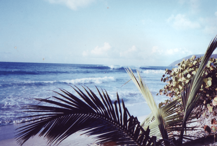 Cane Garden Bay was seven kilometres northeast from Apple Bay. It was the archetypical tropical paradise of sparsely populated, steep wooded hills falling into a tranquil turquoise sea. (Well, sorry for the cliches, but that’s what it was, and still hopefully is). Normally it was an occasional anchorage for a handful of the luxury yachts that frolicked round these islands. But, as I soon learned from the few local surfers, when the big groundswells rolled down from the northwest, the bay’s northern point produced one of the best waves in the Caribbean.