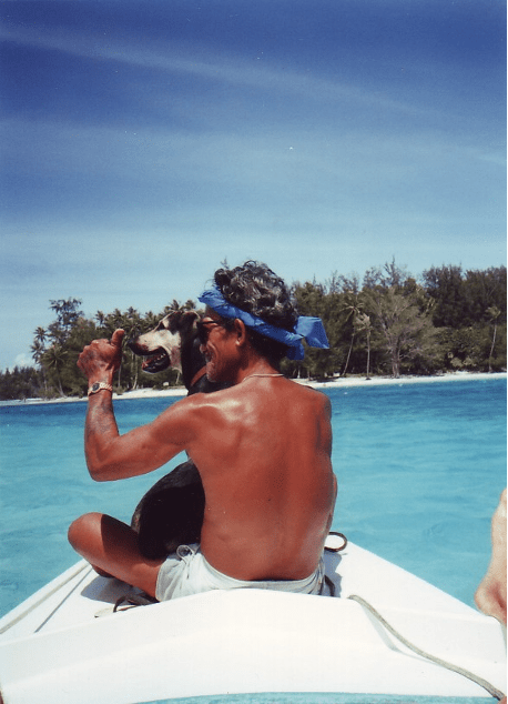 Our ride was on a small white outrigger boat. The path through the shallow water near the island was piloted from the bow by a suave old local with an equally suave dog. They made a picturesque couple in an even more picturesque setting. Electric light blue water in the shallows graded to every shade of dark blue as we left the coast; swaying, sighing casuarina trees partly shaded the bright white sand of the island; and in the distance, Moorea’s breathtaking volcanic peaks rose lush and green into a clear blue sky.